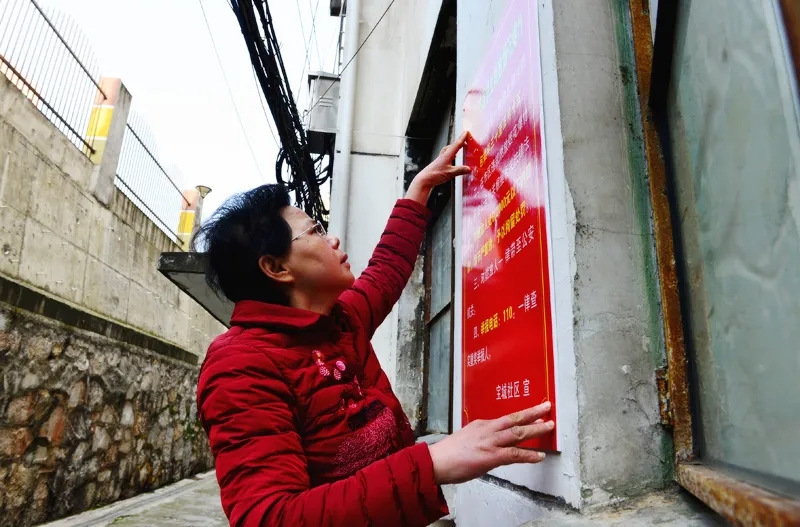 趙玉蓮在小區(qū)張貼禁止燃放煙花爆竹宣傳。圖片來源:宣城文明網(wǎng)