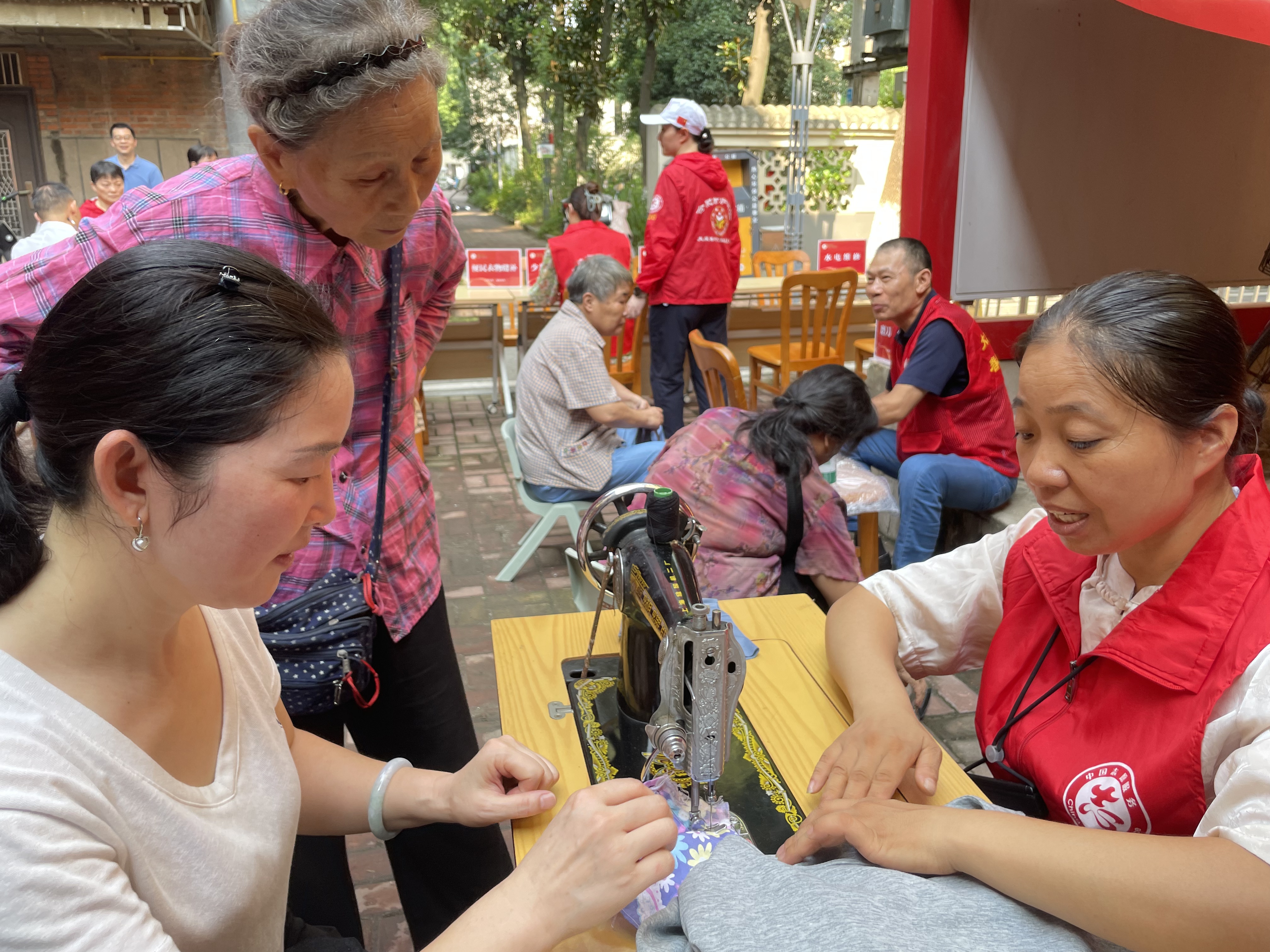 活動現(xiàn)場,各服務(wù)攤位前秩序井然。衣物縫補攤位前,曾是裁縫的志愿者端坐縫紉機前,居民送來的開線外套、需改短的褲子很快就能處理好。“改一件衣服也就十幾分鐘,只要居民送來,基本都能當(dāng)場改好帶走。”志愿者一邊專注操作,一邊笑著回應(yīng)居民的感謝。