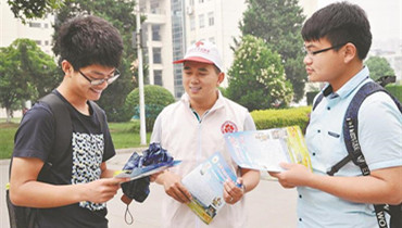 張寶(中)向大學生宣傳造血干細胞捐獻知識。(資料圖片)淮南市紅十字會供圖 一顆心 感動一座城 “中國骨髓捐獻志愿者張寶與韓國患者配型成功后遭遇了車禍,但他住院治療康復后,繼續為這位韓國患者捐獻了骨髓。這位中國志愿者說:‘人...