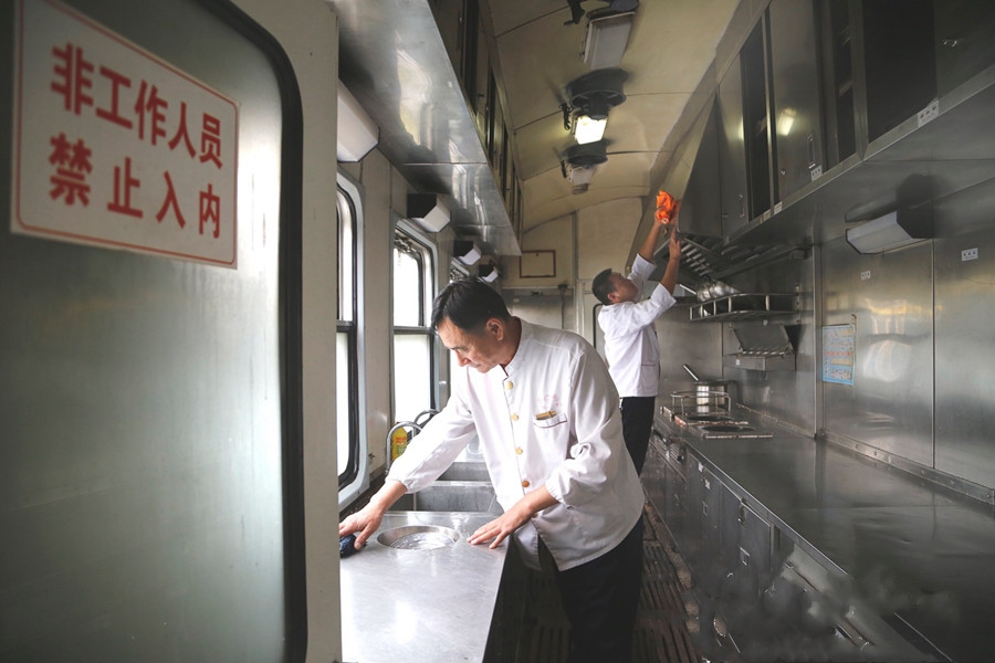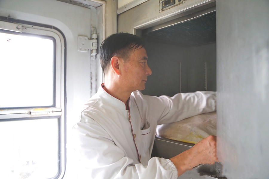 接近正午,3個人要在沒有空調(diào)、沒有風(fēng)扇的車廂里來回穿梭,此時車廂外平均溫度早已達(dá)到在35℃,車廂內(nèi)溫度更是超過40℃?!巴€沒巡視完一節(jié)車廂,還沒晾透的衣服便又濕了?!币呀?jīng)56歲的餐車員張云萍告訴記者。