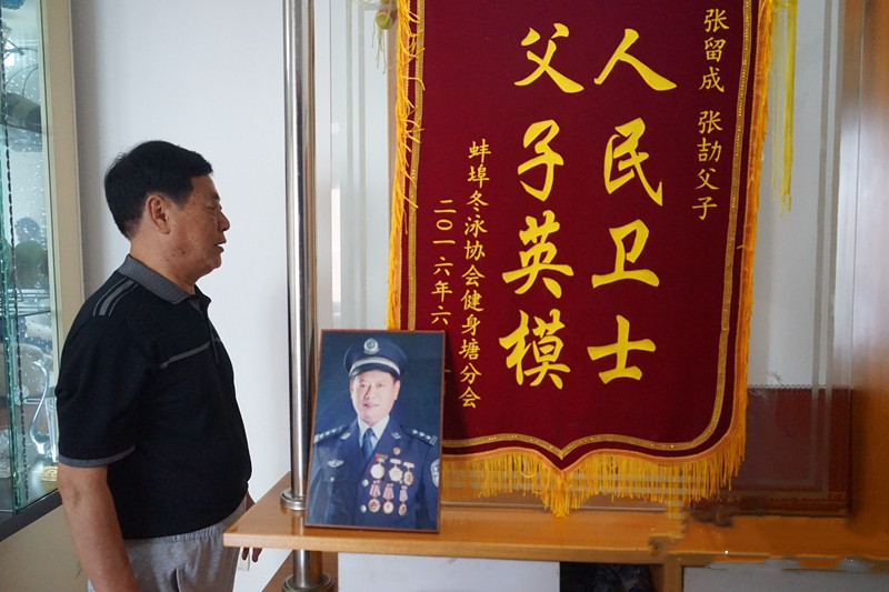 張留成同樣淚流不止。這位兩鬢斑白的老人是張劼的父親,還是一位堅毅的老警。快退休時,他曾徒手與兩名歹徒搏斗,救下三名少女,他自己卻身中七刀,一只耳朵和下頜肉被割下。