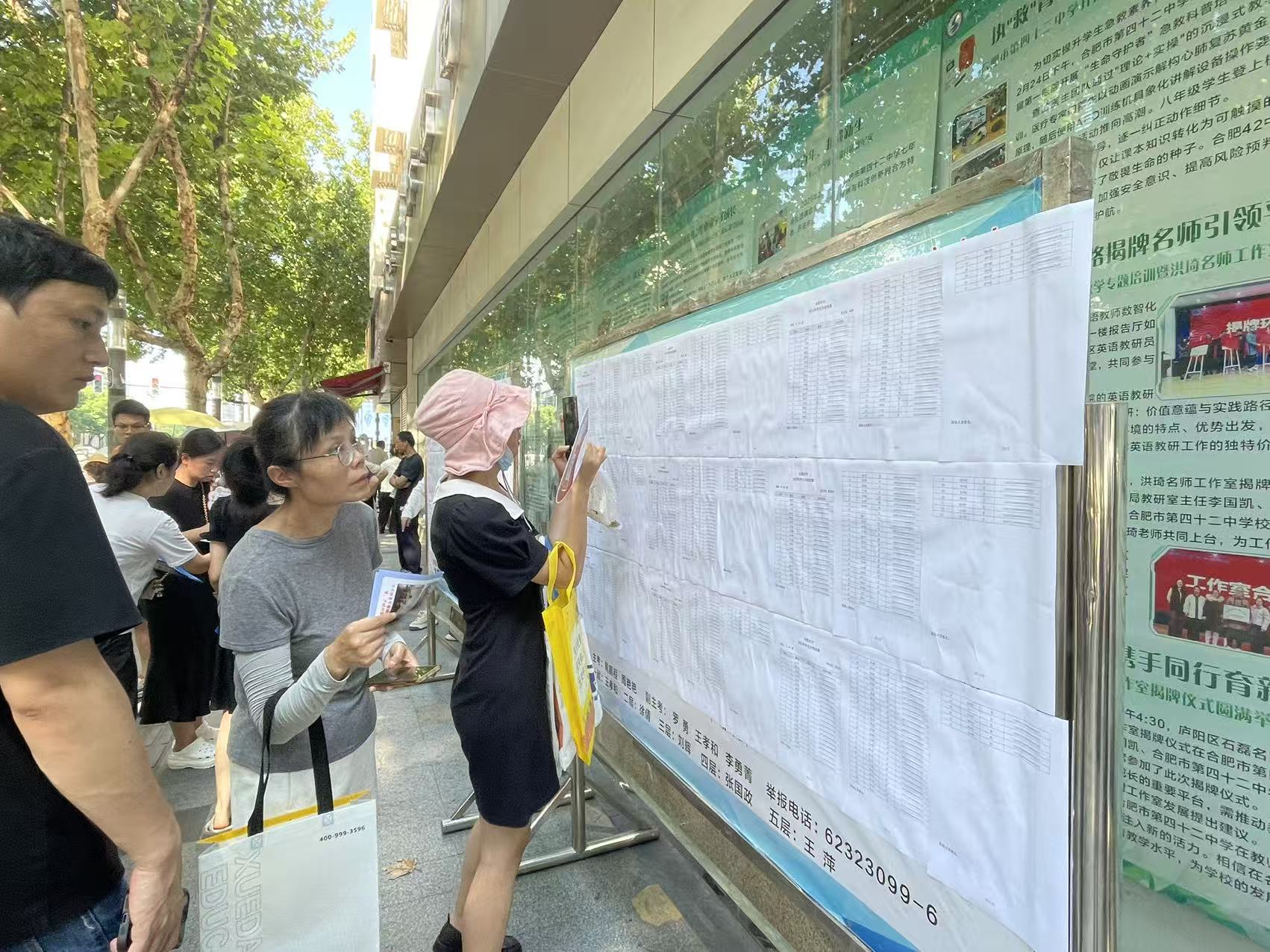 8月28日,長江中路上的第四十二中學校門口熱鬧非凡,眾多七年級新生家長齊聚公示板前,仔細查看孩子的分班結果。