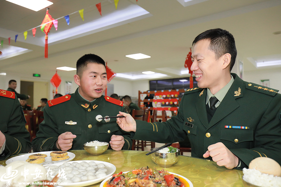 武警安徽省總隊合肥支隊十九中隊中隊長葛宏給新戰士夾湯圓。