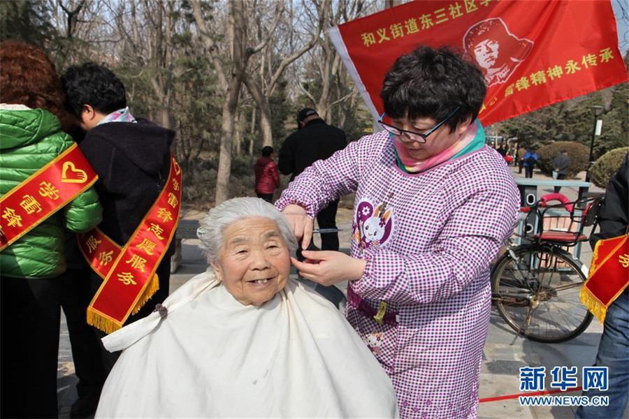 3月4日,北京市豐臺區和義街道的學雷鋒志愿者為老人義務理發。