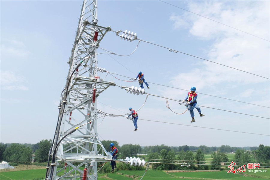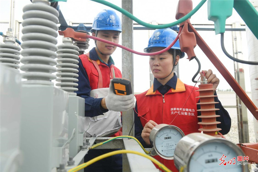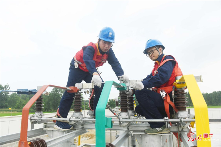 2019年6月27日,總投資2458萬元的安徽省滁州市首座35千伏模塊化變電站正式投產(chǎn)。投產(chǎn)后將進一步緩解當?shù)亟裣母叻逵秒妷毫ΓU隙ㄟh縣東部地區(qū)電網(wǎng)穩(wěn)定運行。圖為施工人員對投運設備進行驗收消缺。(宋衛(wèi)星攝/光明圖片)
