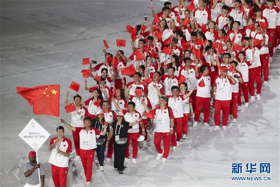 7月3日,中國大學生體育代表團在開幕式上入場。新華社記者孟永民攝