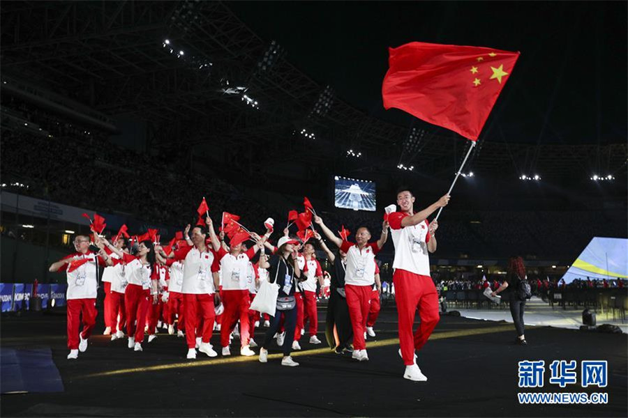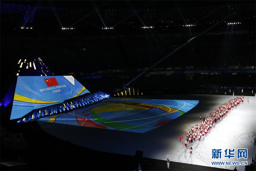 7月3日,中國大學生體育代表團在開幕式上入場。 當日,第30屆世界大學生夏季運動會在意大利那不勒斯開幕。 新華社記者鄭煥松攝
