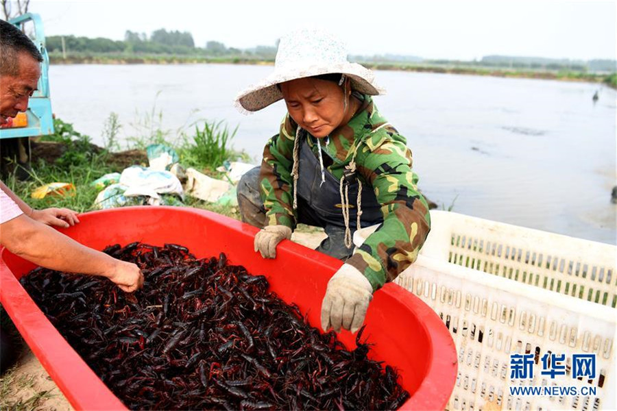 7月17日,明光市明西街道后薛村村民在分揀稻田養(yǎng)殖的小龍蝦。 近年來,安徽省明光市大力發(fā)展“稻蝦共作”立體生態(tài)循環(huán)農(nóng)業(yè),通過“龍頭企業(yè)+合作社”的形式,帶動當?shù)剞r(nóng)民在稻田里進行水稻和小龍蝦立體種養(yǎng)殖,助力農(nóng)民增產(chǎn)增收。 新華社記者 劉軍喜 攝