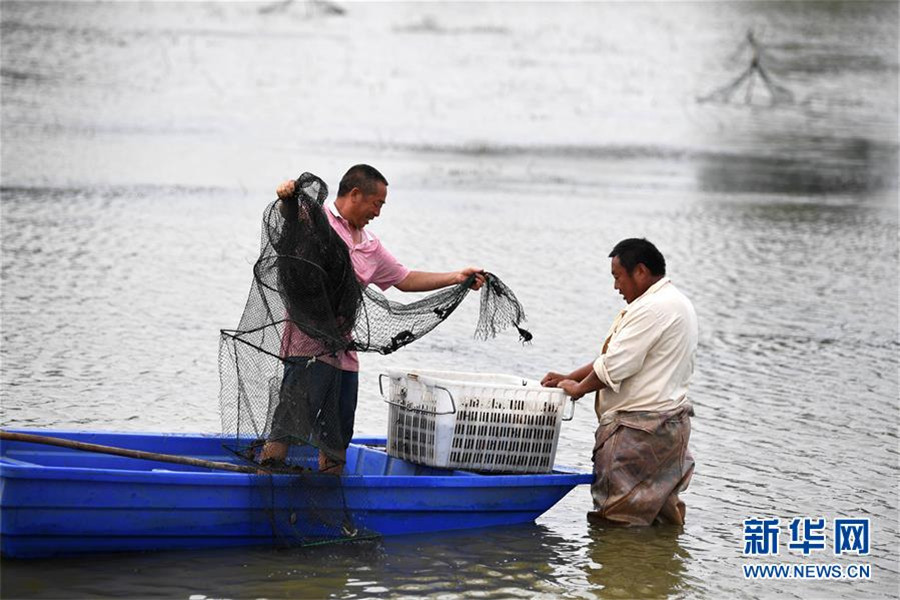 7月17日,明光市明西街道后薛村村民在打撈稻田里養(yǎng)殖的小龍蝦。 近年來,安徽省明光市大力發(fā)展“稻蝦共作”立體生態(tài)循環(huán)農(nóng)業(yè),通過“龍頭企業(yè)+合作社”的形式,帶動當?shù)剞r(nóng)民在稻田里進行水稻和小龍蝦立體種養(yǎng)殖,助力農(nóng)民增產(chǎn)增收。 新華社記者 劉軍喜 攝