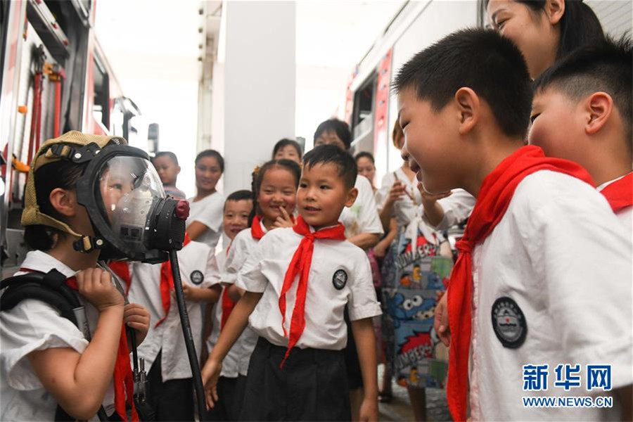 7月17日,小學生在體驗消防救援裝備。 當日,安徽省合肥市逍遙津小學組織學生及家長走進合肥市消防救援支隊特勤大隊一中隊,通過學習消防知識,提高安全自救意識。 新華社記者 張端 攝