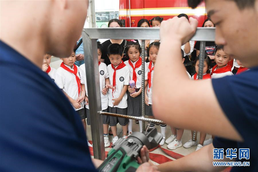 7月17日,消防隊員(前)在給小學生演示如何操作消防救援工具。 當日,安徽省合肥市逍遙津小學組織學生及家長走進合肥市消防救援支隊特勤大隊一中隊,通過學習消防知識,提高安全自救意識。 新華社記者 張端 攝
