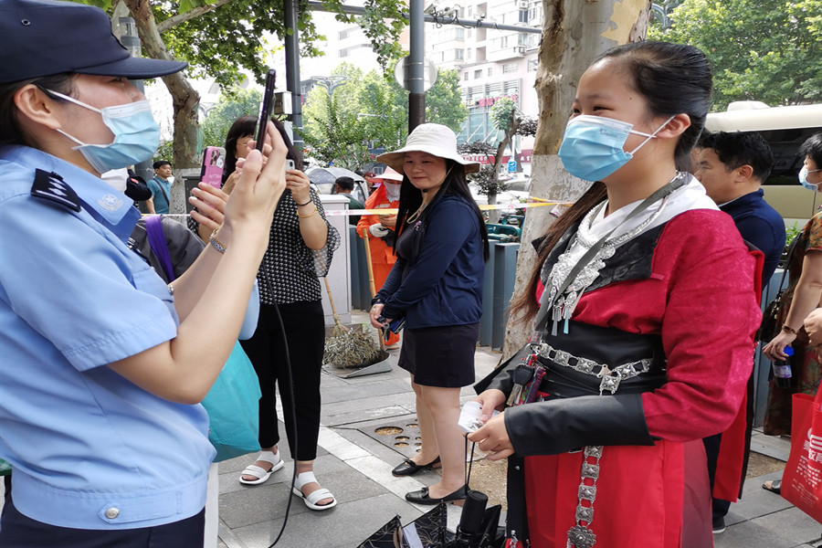 合肥四十二中考點(diǎn)門口,一位考生的表妹身穿紅色長(zhǎng)裙,上面掛滿了銀飾,希望保佑表姐考試順利。