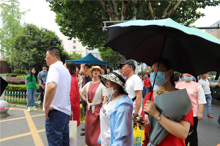 11:19,合肥九中考點(diǎn),家長(zhǎng)們?cè)谛iT口翹首以盼,焦急地等待著。
