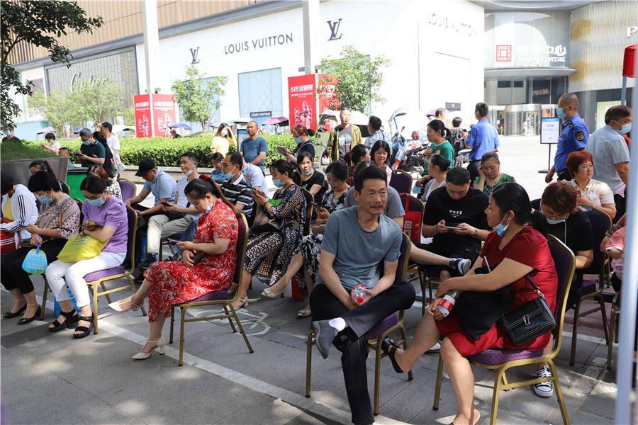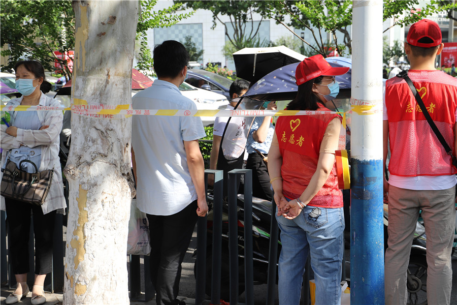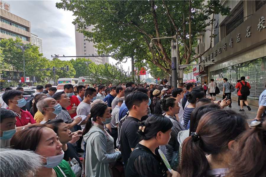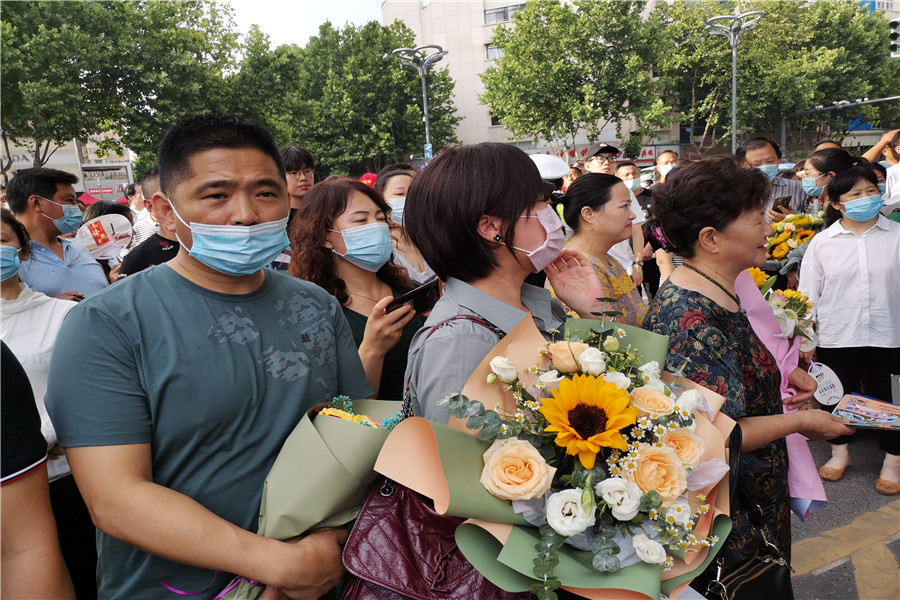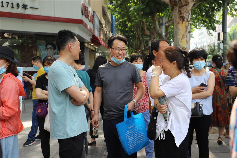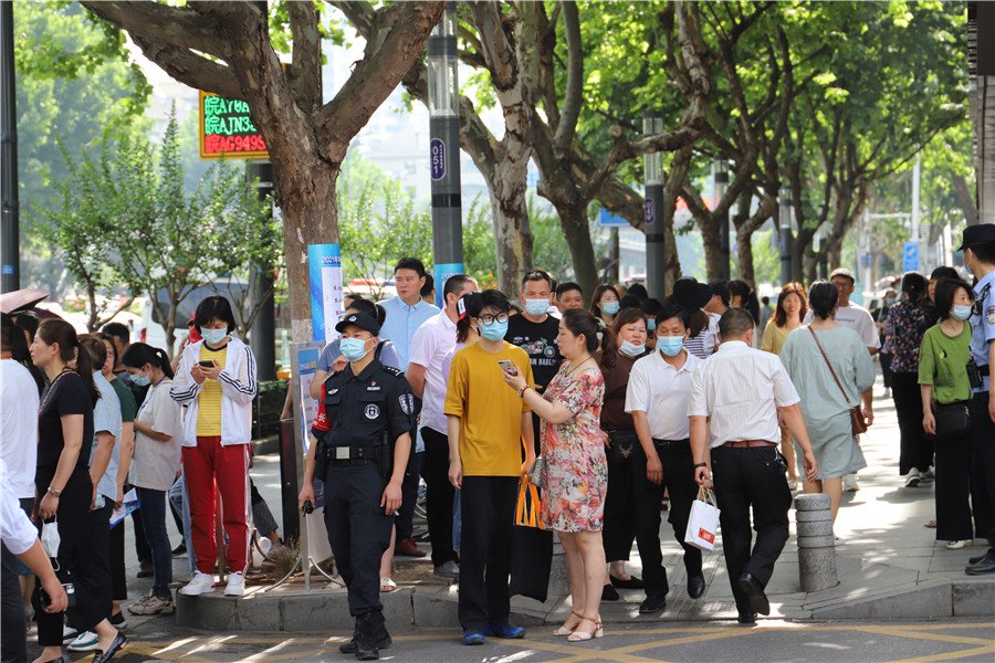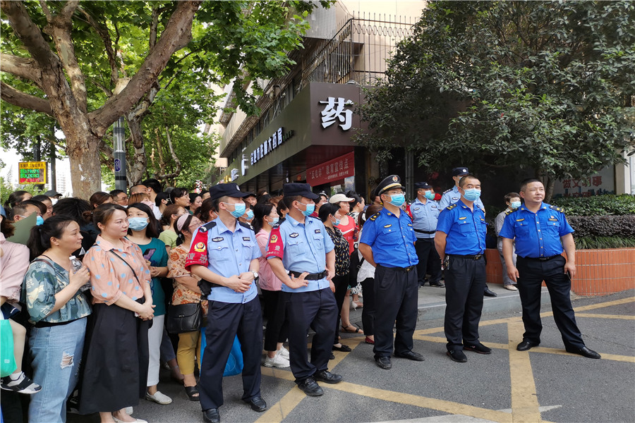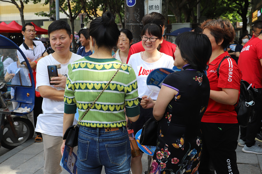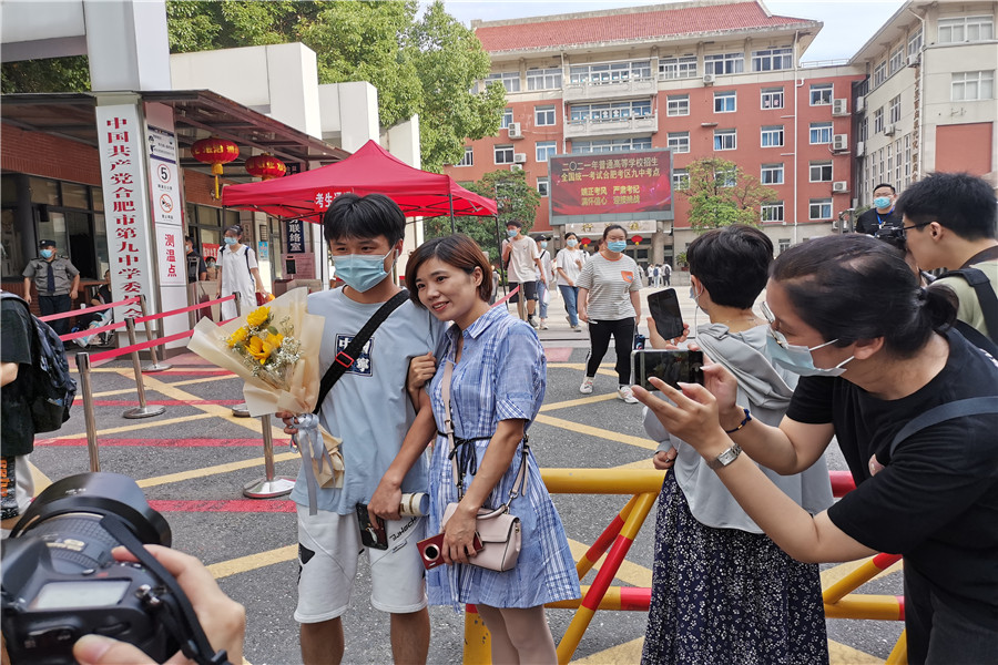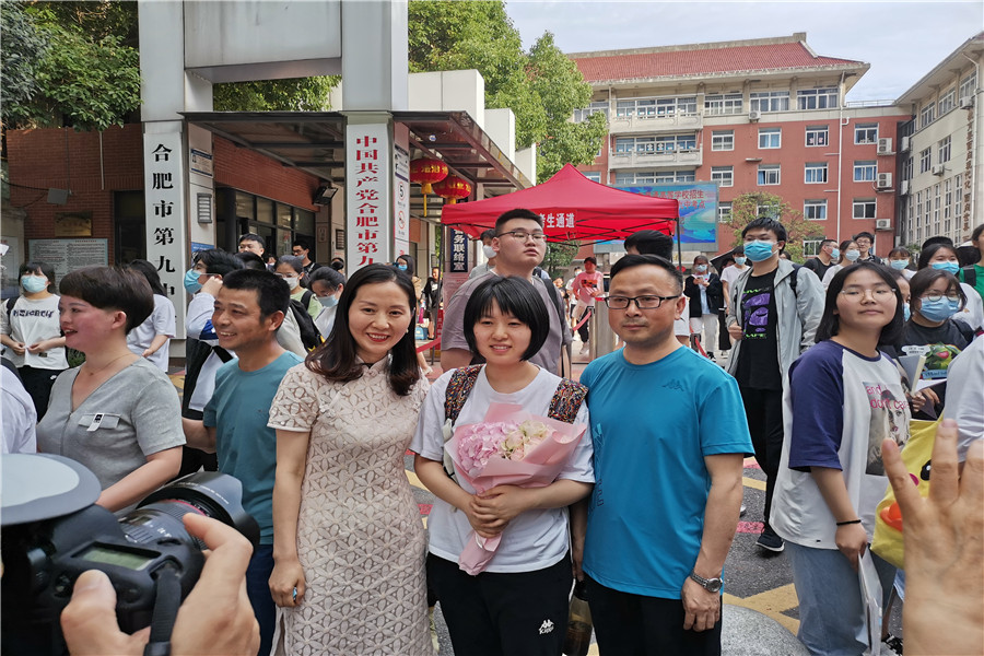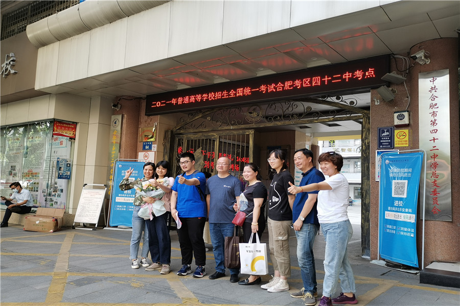 8:56,合肥四十二中考點(diǎn)。考生們進(jìn)場(chǎng)后,家長(zhǎng)們?cè)诳紙?chǎng)外閑聊,交流經(jīng)驗(yàn)。