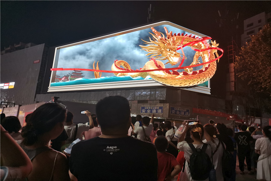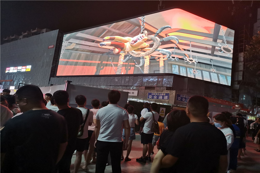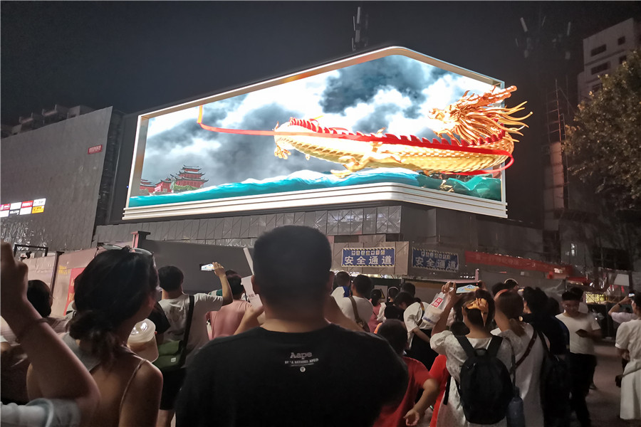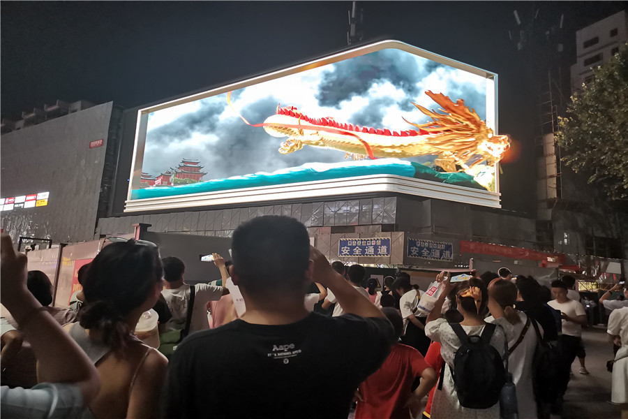 逼真的宇宙飛船、巨龍充滿未來科技感,似乎要沖出大屏幕,現(xiàn)場觀賞的市民紛紛驚嘆。裸眼3D大屏由540塊單體屏幕組合而成,面積達490平方米,屏幕呈L形,轉(zhuǎn)角平滑,可呈現(xiàn)無縫銜接的空間裸眼3D感。