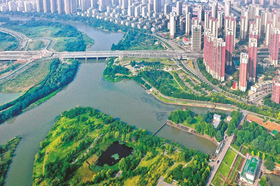 8月19日,航拍的六安市城區(qū)九里溝水利文化公園。近年來,該市通過景觀提升、水利文化和創(chuàng)意游園建設(shè),打造集濕地保護(hù)與旅游、科普宣教、城市休閑于一體的特色文化公園,讓市民共享綠色發(fā)展帶來的“紅利”。