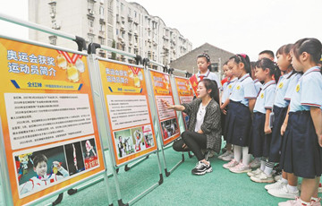 8月29日,合肥市大通路小學教育集團大通校區老師在展板前給一年級新生講解奧運冠軍的成長故事。當日,該校結合“奧運”主題舉辦一年級新生入學儀式,讓孩子們感受冠軍們頑強拼搏、努力進取的奧運精神。本次活動中,通過精心設置的一些運動項目,幫助孩子們從小養成良好的運動習慣。