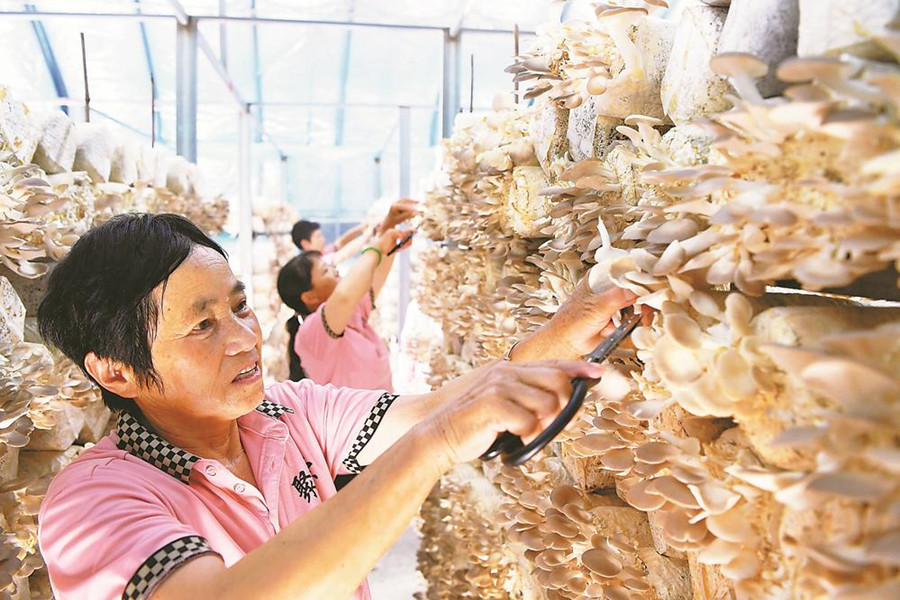 6月21日,六安市金寨縣關(guān)廟鄉(xiāng)大埠口村秀珍菇種植基地的工人在加緊采摘秀珍菇,分揀后銷往市場(chǎng)。