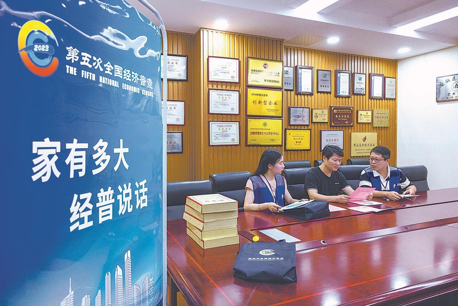 8月23日,在合肥廬陽經濟開發區,經濟普查員正在走訪轄區企業、個體工商戶,開展第五次全國經濟普查(普查標準時點為2023年12月31日)宣傳工作。據悉,該開發區通過準確劃分普查區和普查小區,繪制普查地圖,組織104名普查員進行逐戶清查,分類填表,確保普查對象不重不漏。