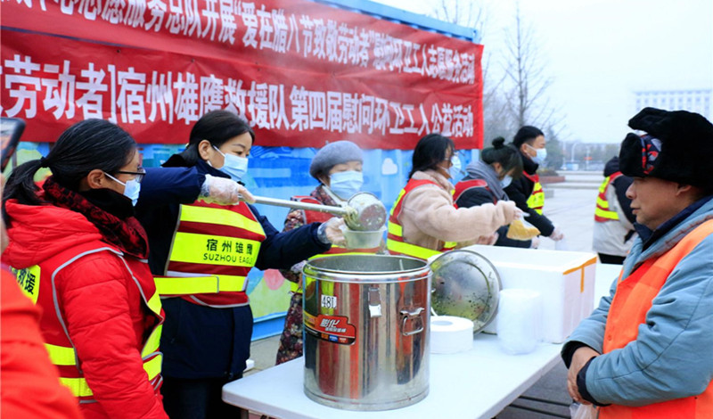 1月18日,宿州市埇橋區新時代文明實踐中心志愿服務總隊聯合雄鷹救援隊的志愿者,將熱氣騰騰的臘八粥送到了正在街頭巷尾清掃衛生的環衛工人手中。