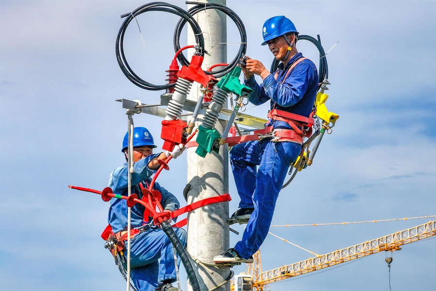 7月22日,在亳州市槐花路施工現場,國網亳州供電公司施工人員在高溫下安裝10千伏線路跌落保險及附件,全力保障供電安全。