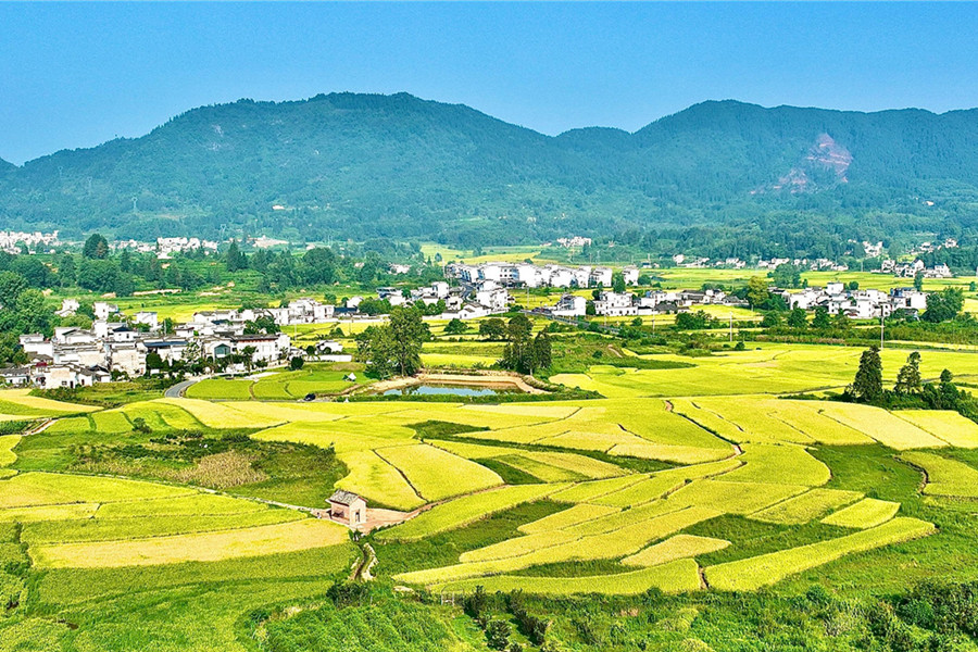 8月24日,黟縣碧陽鎮(zhèn)潘村,金黃的田野與遠山、晨霧、村莊共同組成一幅和美鄉(xiāng)村畫卷。