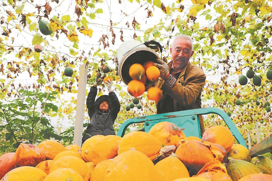 10月19日,阜陽市潁東區口孜鎮焦莊村瓜蔞種植基地,村民在采收成熟的瓜蔞。近年來,該區大力發展瓜蔞種植產業,延伸拓展產業鏈,促進農業增效、農民增收。