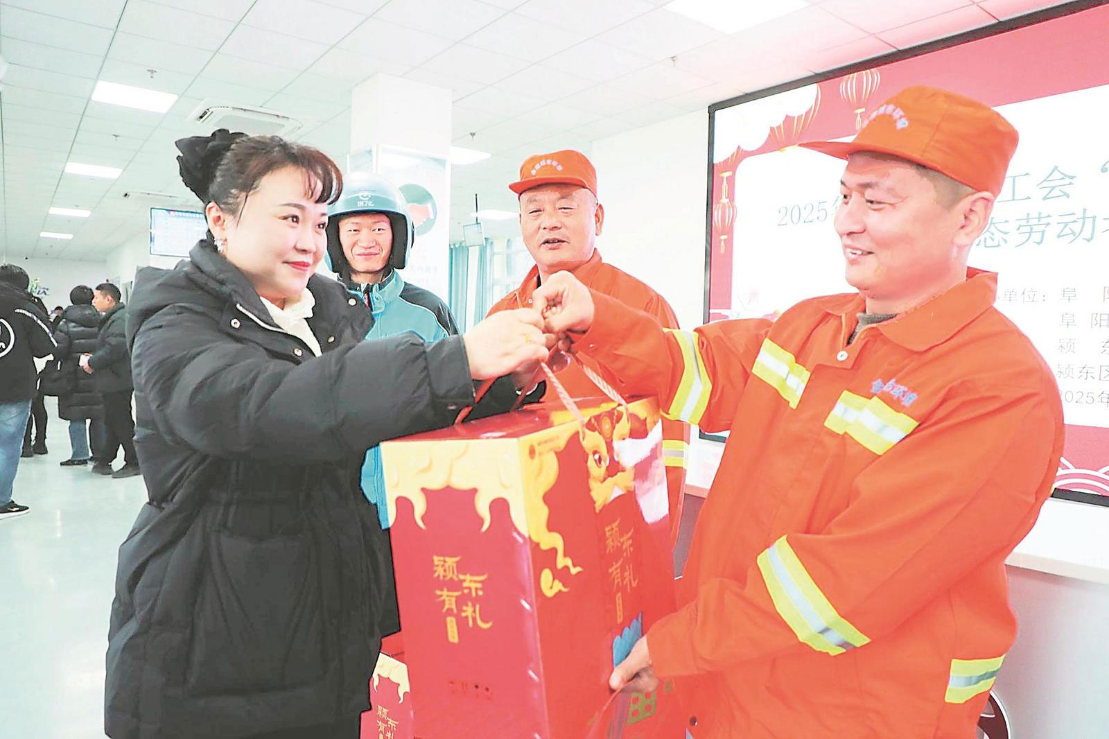 1月17日,在阜陽市潁東區(qū)數(shù)據(jù)資源管理局工會驛站,工作人員為戶外勞動者發(fā)放新年大禮包。當(dāng)日,阜陽市總工會等部門開展走訪慰問活動,為戶外勞動者送上冬日里的暖心關(guān)懷。通訊員 宿飛 趙錦萱 攝