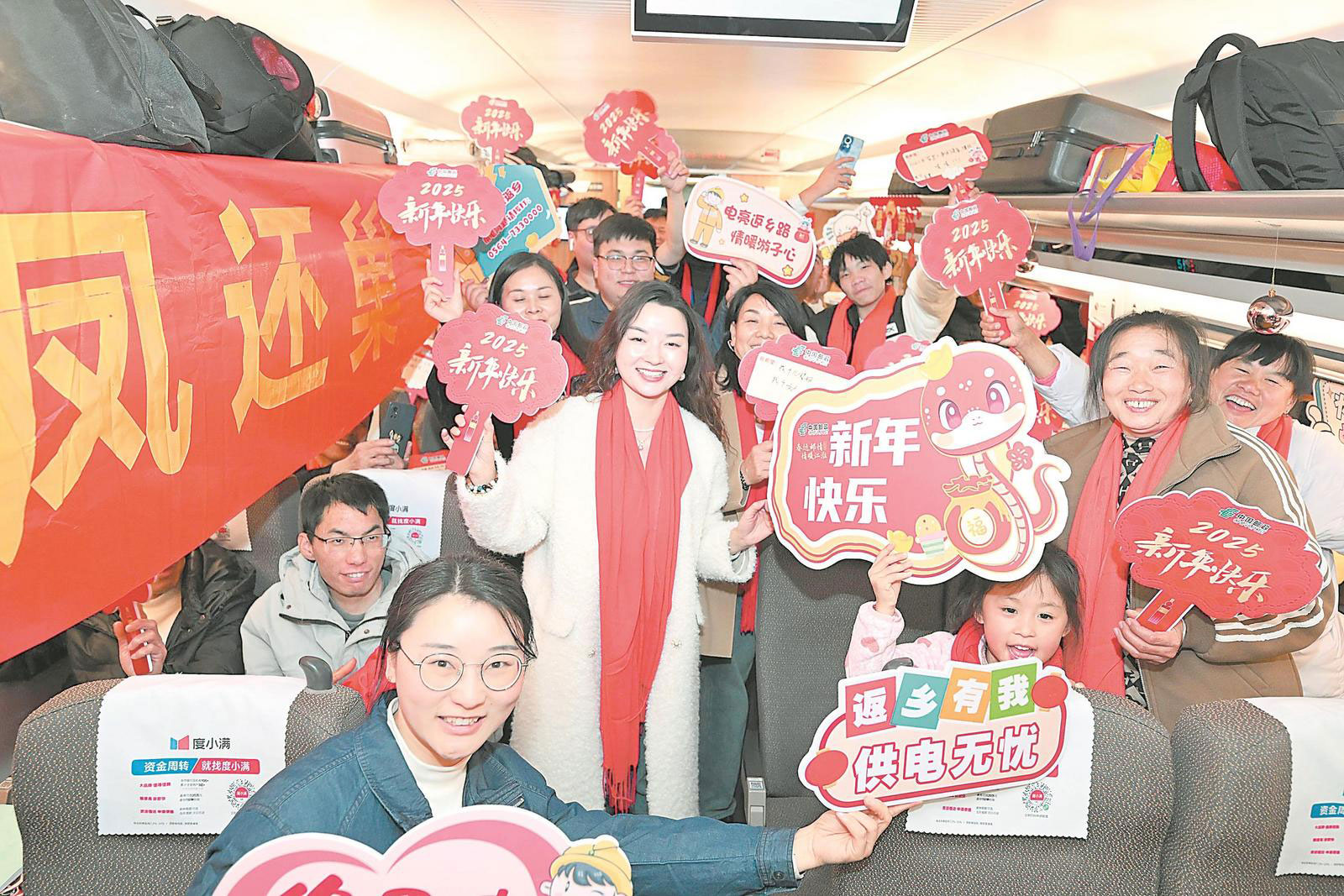 1月22日,第七屆“春運郵情,情暖江淮”關(guān)愛外出務(wù)工創(chuàng)業(yè)人員大型公益活動專列、專廂滬蘇浙三地首發(fā)車從上海松江發(fā)往安徽金寨,536名返鄉(xiāng)人員在列車上歡慶小年夜。記者 張大崗 攝
