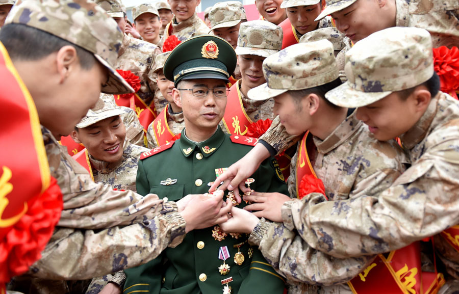 在安徽省合肥市國防動員訓練基地,抗戰老兵宣鉅華與新兵一起高唱《強軍戰歌》。(徐偉攝影)