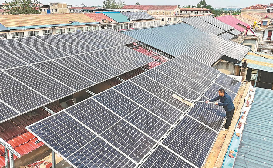 5月28日,濉溪縣南坪鎮(zhèn)任集村村民任印才清理著自家屋頂光伏面板,屋頂可發(fā)電、余電能賣錢,成為村民的生產(chǎn)生活新方式。