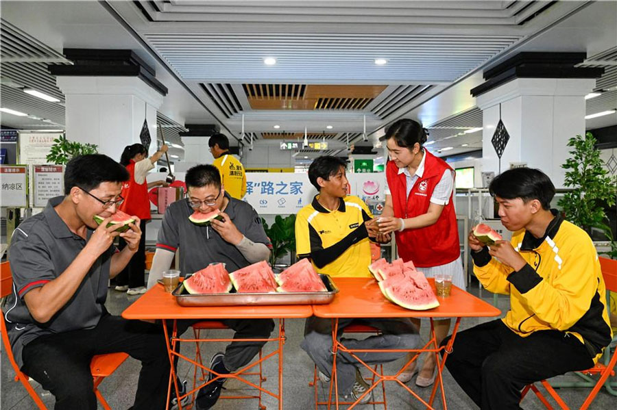 7月2日,在合肥市廬陽(yáng)區(qū)海棠街道轄區(qū)內(nèi)海棠地鐵站,快遞、外賣配送員在“驛站”納涼休息。該“驛站”為新就業(yè)群體、戶外勞動(dòng)者免費(fèi)提供充電、飲水等服務(wù)。本報(bào)通訊員 趙明 攝