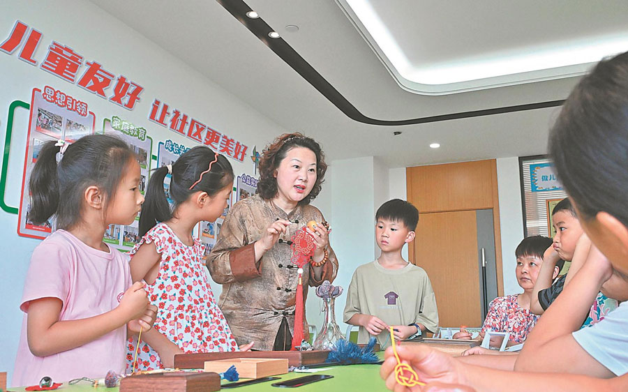 7月2日,合肥市包河區(qū)義城街道迎淮社區(qū),小朋友在老師的帶領下學習廬州繩記非遺技藝。本報記者 程兆 攝