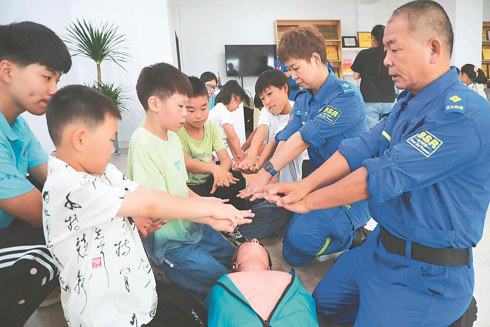 7月7日,六安市金安區(qū)望城街道正陽社區(qū),學(xué)生們在六安市藍天救援隊隊員的指導(dǎo)下學(xué)習(xí)心肺復(fù)蘇等急救知識,提高安全防范意識和自救能力。通訊員 田凱平 攝