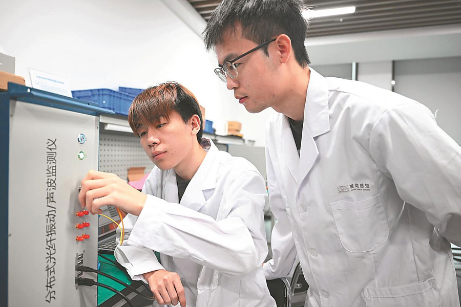 9月9日,研發人員黃興國(前)與王萌正在調試軌道交通安全光纖智能預警系統。