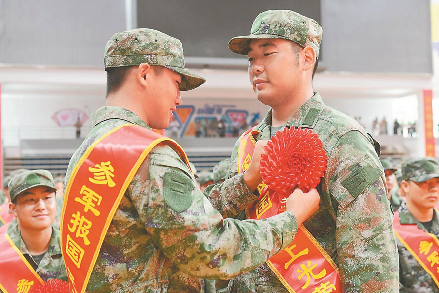 9月16日,在阜陽(yáng)市2025年下半年新兵入伍歡送暨第25個(gè)全民國(guó)防教育日主題活動(dòng)現(xiàn)場(chǎng),新兵相互整理胸前大紅花。據(jù)悉,該市1300余名新兵即將離開家鄉(xiāng)奔赴軍營(yíng)。特約攝影 王彪 攝