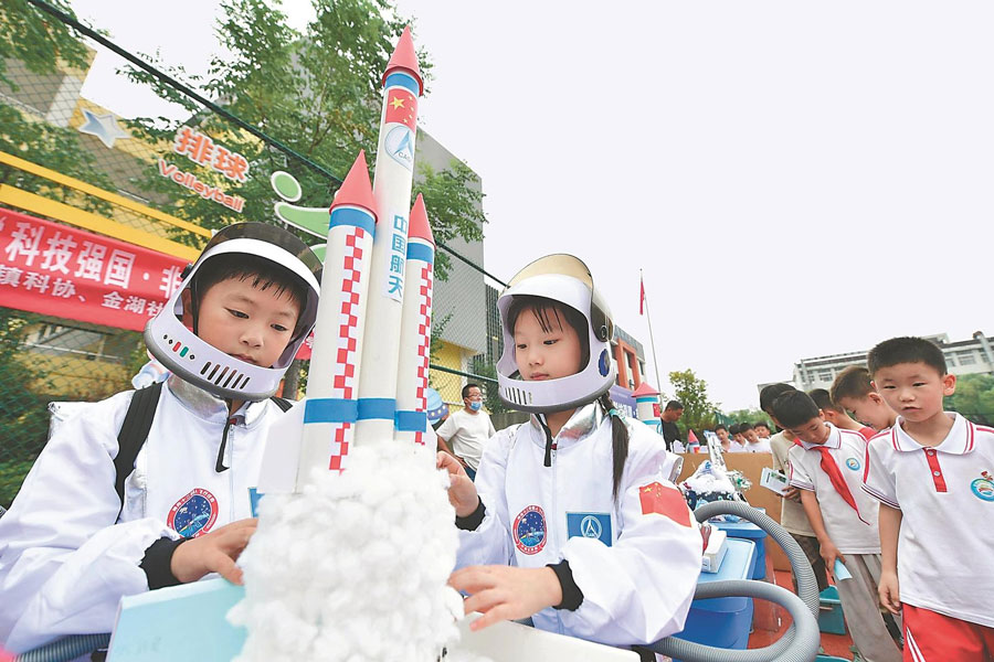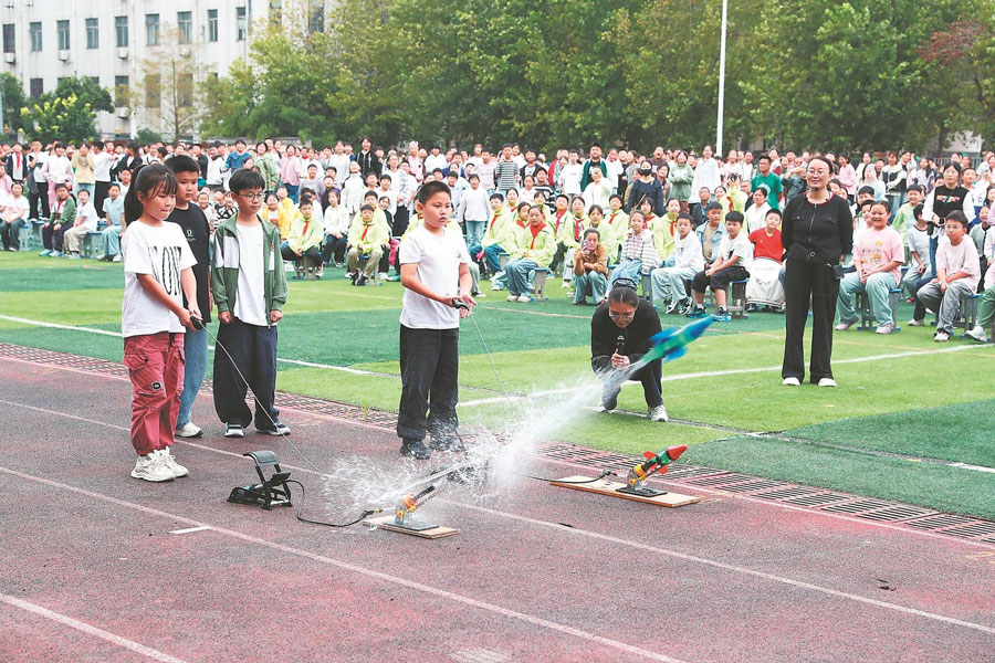 9月17日,蒙城縣莊子小學操場,小學生在發射自己制作的“火箭”模型。當天,該校舉辦科技文化節,小學生競相展示他們制作的各類科普成果及小發明等。本報通訊員 胡衛國 攝