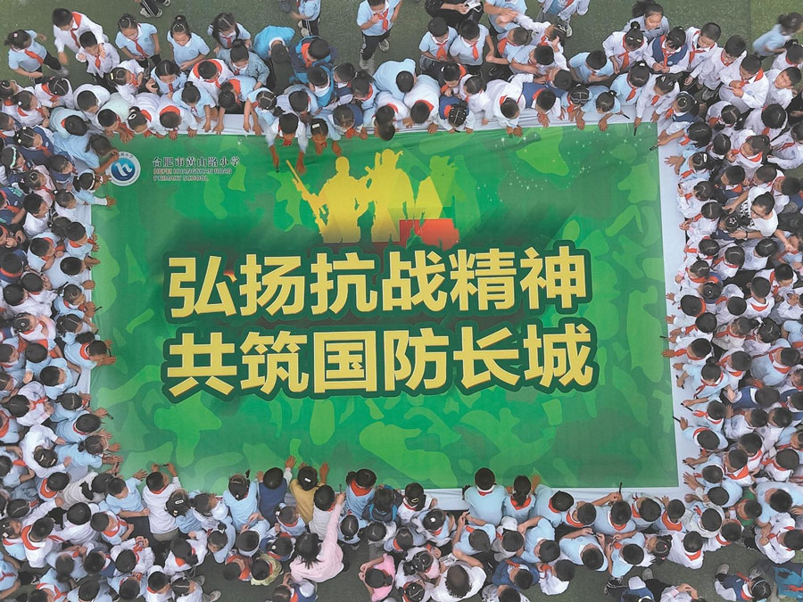 9月18日,合肥市黃山路小學(xué)學(xué)生在國防主題畫布上簽名。當(dāng)天,該校開展“弘揚抗戰(zhàn)精神 共筑國防長城”國防教育進校園活動,引導(dǎo)學(xué)生樹立國防觀念,厚植愛國主義情懷。通訊員 葛宜年 攝