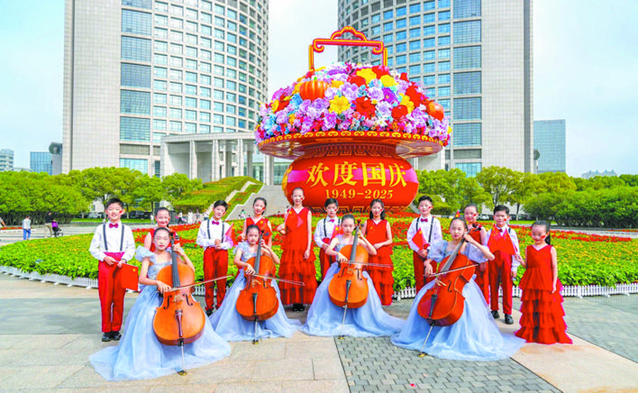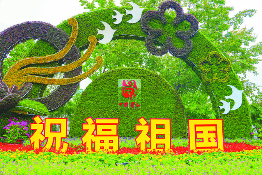 潛山路與休寧路交口的花展將綠色生態(tài)理念與科技創(chuàng)新元素相結(jié)合,如意造型的綠雕、象征創(chuàng)新的芯片圖案,與紛飛的和平鴿、蝴蝶共同勾勒出一幅綠色發(fā)展、家國(guó)同慶的盛世圖景,祈愿人與自然和諧共生。
