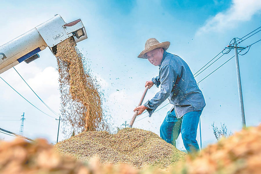 10月8日,蕪湖市繁昌區峨山鎮城東村,農機手在操作農機收割水稻。 本報通訊員 肖本祥 攝