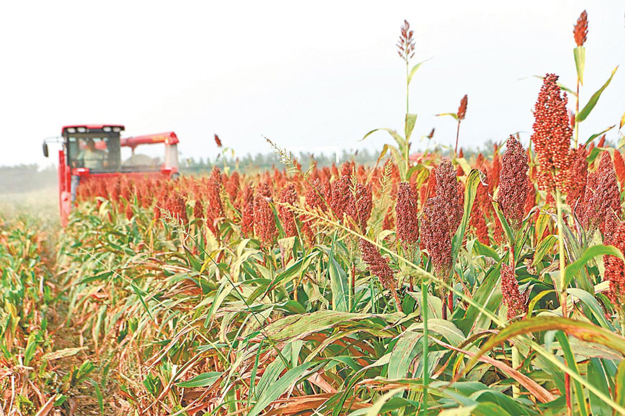 10月8日,安徽農墾集團淮南農場農機手在操作機械搶收高粱。目前,淮南市積極組織機械搶收秋糧,確保秋糧應收盡收。特約攝影 陳彬 攝