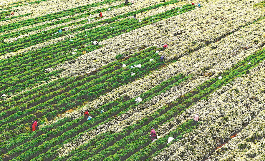 10月9日,亳州市譙城區十八里鎮蔣李村,農民在菊花種植基地采收菊花。本報通訊員 劉勤利 攝