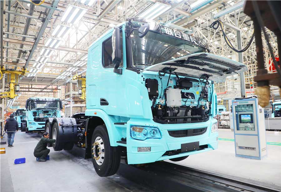 12月16日,位于蕪湖國家高新區的奇瑞商用車聯合重卡總裝車間,工人在生產電麒麟純電牽引車。今年以來,奇瑞商用車聯合重卡持續提升產品競爭力,呈現出產銷兩旺的勢頭。本報通訊員 程依寶 攝