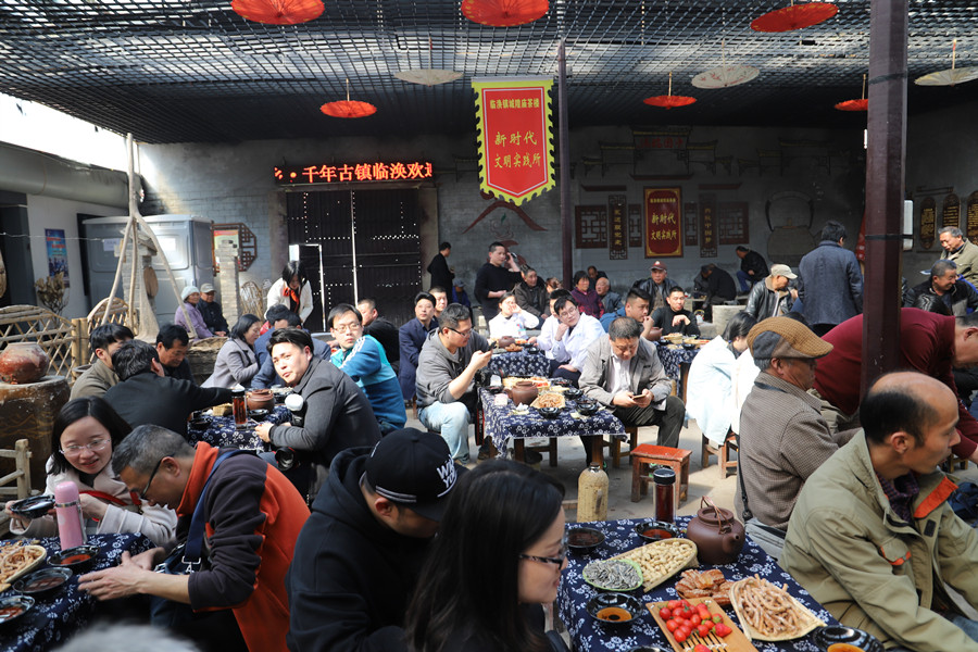 “柴米油鹽醬醋茶,生活不能離開它。”茶館文化濃縮著臨渙百姓的淳樸精神和生活風(fēng)格。臨渙茶館最早的雛形是晉代的茶攤,唐代,臨渙成為蘇、豫、皖貿(mào)易往來的重要商埠,茶館開始出現(xiàn)。經(jīng)過宋元明清民國的發(fā)展,茶館文化已經(jīng)融入了臨渙百姓的血液和骨髓里,成了他們居家過日子必不可少的重要關(guān)節(jié)。2017年,“臨渙飲茶習(xí)俗”入選第五批省級非物質(zhì)文化遺產(chǎn)名錄。