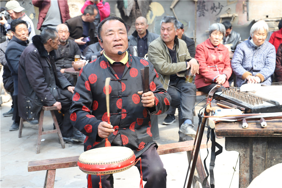 在一家名為“城隍廟茶樓”的茶館內(nèi),擺著數(shù)十張小茶桌。此時已人聲鼎沸,游客和臨渙當(dāng)?shù)匕傩找黄饑蓝戎R渙棒棒茶吃著點心,正中央在上演著淮北琴書、淮北大鼓等非遺民俗節(jié)目。“我離這里有八九里路,一有空就來,習(xí)慣了,點一壺茶才五毛錢,能坐著喝一天。”臨渙鎮(zhèn)的居民劉福元說道。