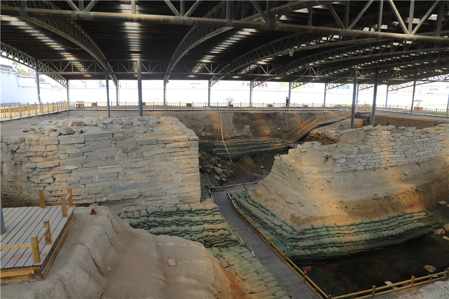 在隋唐大運河遺址博物館院內(nèi),一座不起眼的開放式建筑物下,正是隋唐運河柳孜碼頭遺址。在現(xiàn)場能清楚地看到運河的走向和兩座橋墩遺跡,河道中甚至還散落著宋代的船錨和鐵鏈。