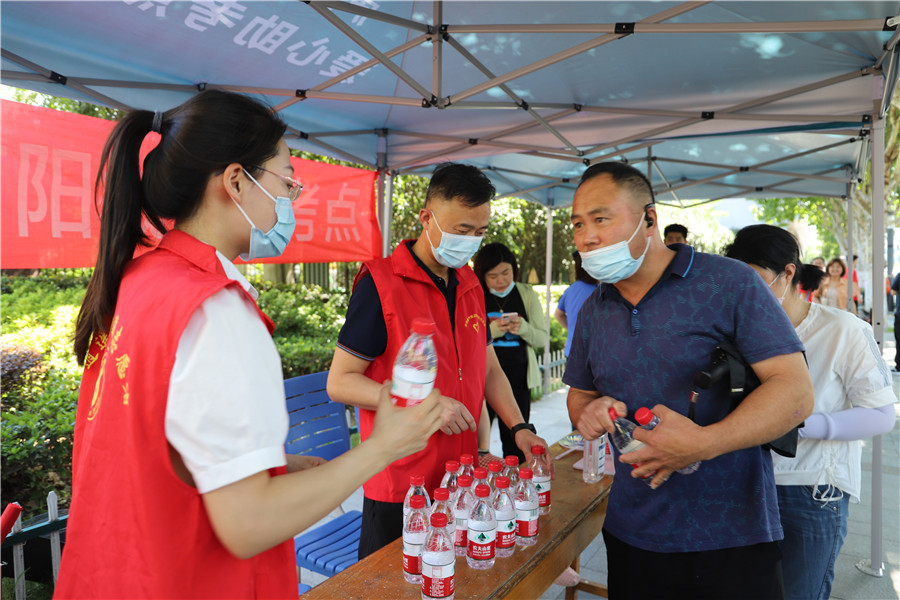中午11點,圍在門口焦急等待的人群越來越密集,雖然家長們被曬得汗流浹背,卻仍翹首企盼。志愿者們紛紛給來往的家長遞飲水,同時開始協助人群疏散引流。下午4點30分,有位年輕家長臉色蒼白,因低血糖在服務臺附近暈倒,志愿者們眼疾手快及時接住,幫忙叫來值班醫生診斷并給患者喂糖,第一時間解決了突發事件。