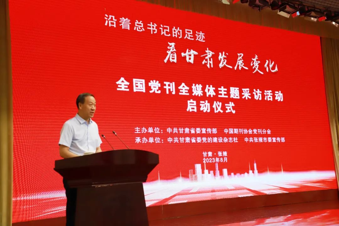 本網訊 八月隴原滿目新,感恩奮進正當時。為全面貫徹落實黨的二十大精神,深入開展學習貫徹習近平新時代中國特色社會主義思想主題教育,8月7日,“沿著總書記的足跡 看甘肅發展變化”全國黨刊全媒體主題采訪活動在甘肅省張掖市正式啟動。中國期刊協會會長吳尚之出席啟動儀式并講話,甘肅省委宣傳部、中國期刊協會黨刊分會、張掖市委宣傳部負責同志,《求是》《旗幟》、“學習強國”學習平臺等中央媒體及全國各省(區、市)黨刊社的負責同志和全媒體記者參加了啟動儀式。